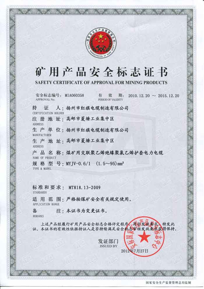 煤礦礦用產(chǎn)品安全標志證書-MYJV